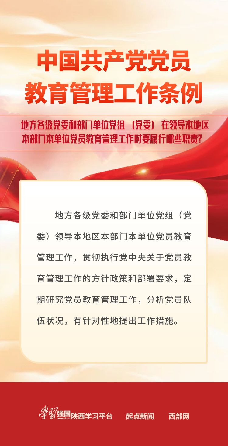 【学习卡片】《中国共产党党员教育管理工作条例》:地方各级党委和部门单位党组(党委)在领导本地区本部门本单位党员教育管理工作时要履行哪些职责?